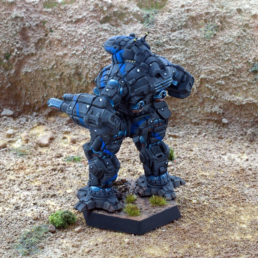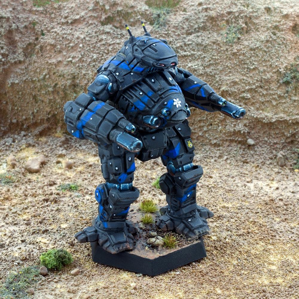 Alpha Galaxy uses shaded charcoal grays blended with a blue-gray camouflage pattern and small white "rocks" with a black crescent moon outline for parade, ceremonial, and some combat operations.Canonized by CSO on 12/1/2004. Other references: Madcat, CB: Miniatures Rules (p 28) Gladiator, CB: Miniatures Rules (p 28) Elemental BA, FM: Warden Clans (plate 5) Mad Dog, Battle of Tukayyid (p 153) Gargoyle, Battle of Tukayyid (p 179) Viper, Dominions Divided (p 32) Karhu, Kodiak, Dominions Divided (p 81)
