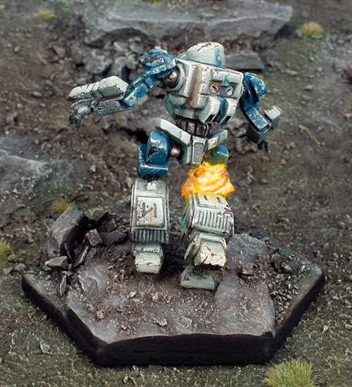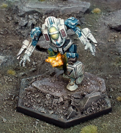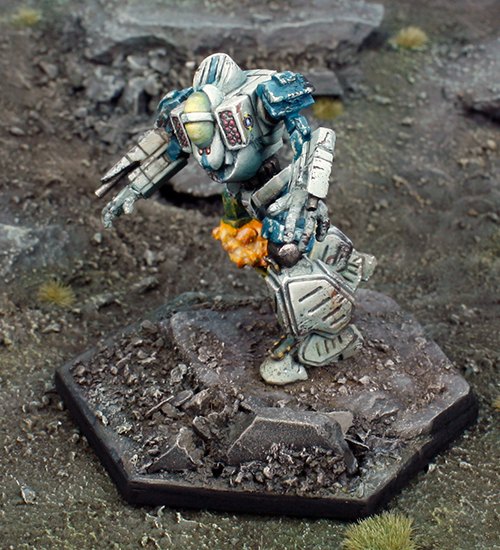 This Knight of the Republic’s custom painted Arbalest just suffered a crippling hit to the Mechs right knee. The miniature has been reposed, exaggerating the stance of the stock model. Also the closed fists have been replaced with Brigand hands.