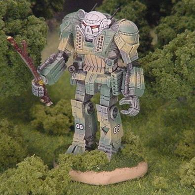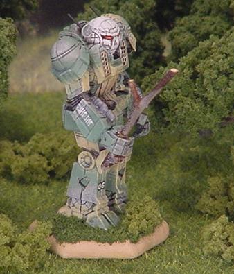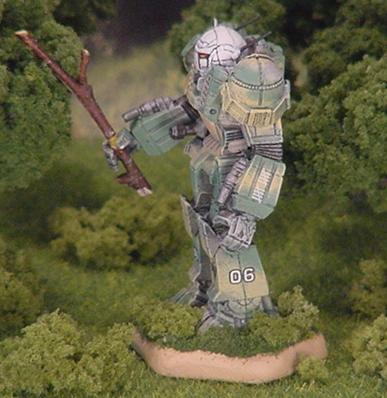 This mini was painted with Testor’s Light Sea Gray, and washed with a light black wash. The green areas are a heavy drybrush of Americana Arbor Green, with Americana Cashmere Beige used for the tan areas. A light drybrush of Ceramcoat Quaker Gray was added for blending and weathering.