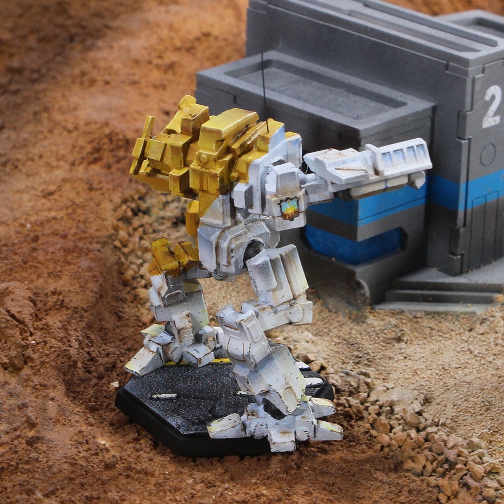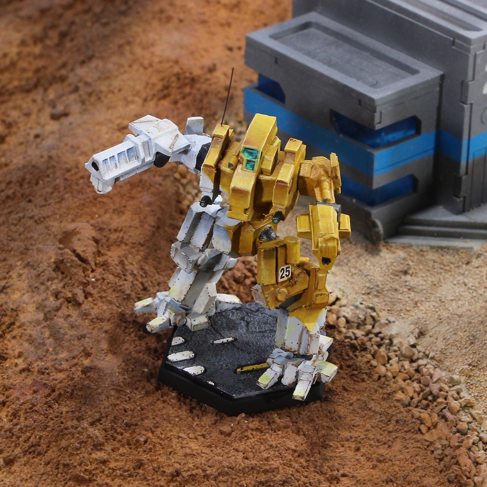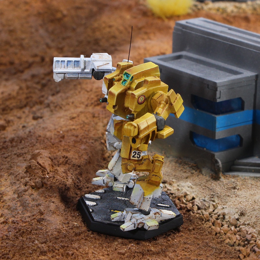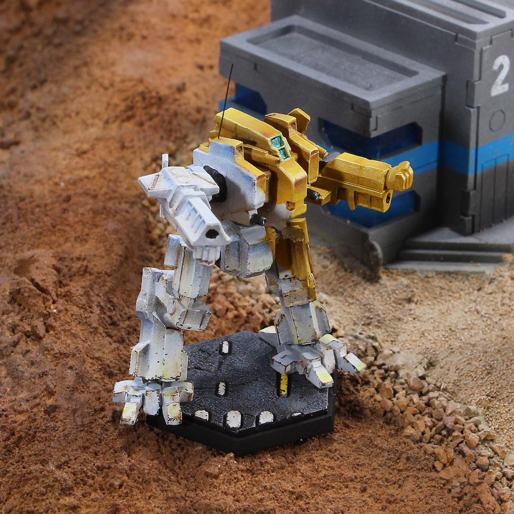 The Dawn Guards generally use a white and golden yellow scheme. The yellow is painted diagonally across the ‘Mech from the top of the right shoulder to the bottom of the left leg and the white covers the lower half of the ‘Mech. While this is the standard scheme, the regiment has also been known to paint its units in primer gray, olive drab, or other colors appropriate to the deployed environment.