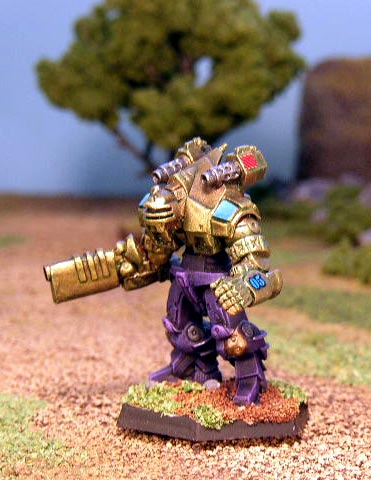 Pharaoh Keshik ‘Mechs’ legs and lower torso are painted in several shades of purple, with bronze highlights on the legs. The upper torso and arms are painted in bronze with turqouise highlights.