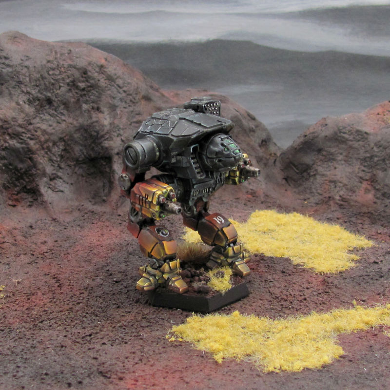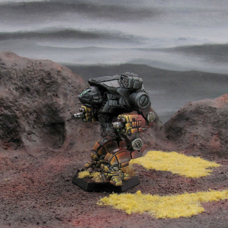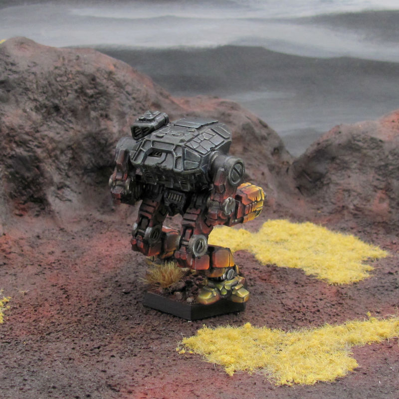 Beta Galaxy paints the body of their 'Mech black, with arms and legs transiting from dark red to bright orange or yellow.