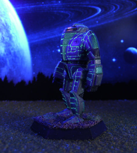 This mini was painted using Delta Ceramcoat Storm Gray, Rain Gray, Drizzle Gray, and Deco Art Crystal Green. The fluorescent panel lines were painted with Apple Barrel Green Glow-in-the-dark paint and lit with a blacklight, then lined over in black for the day shot.