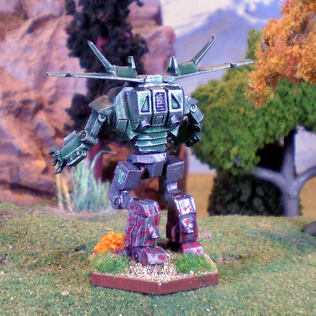Omega employs a scheme of metallic emerald green on top and a steel finish on the lower halves of their equipment. This symbolizes Jade Falcon`s superiority over Steel Viper. Red paint is splattered on the feet and shins of their 'Mechs to indicate their intentions with the Viper Clan. Canonized by CSO on 2/21/07.Other references: none