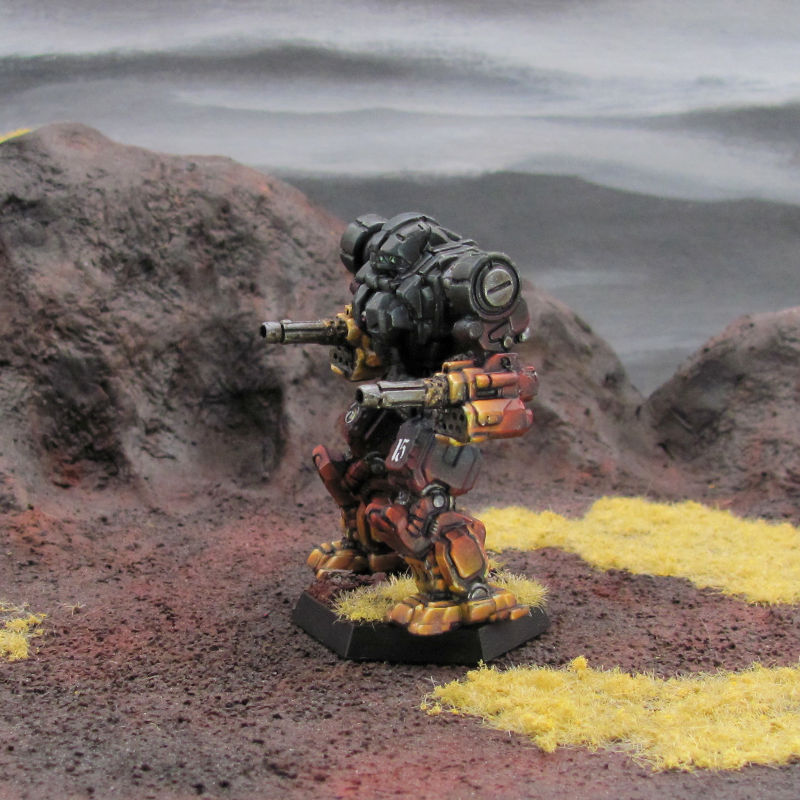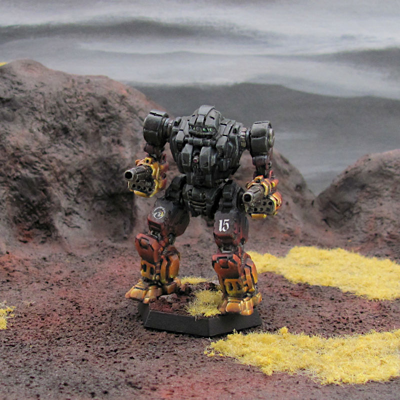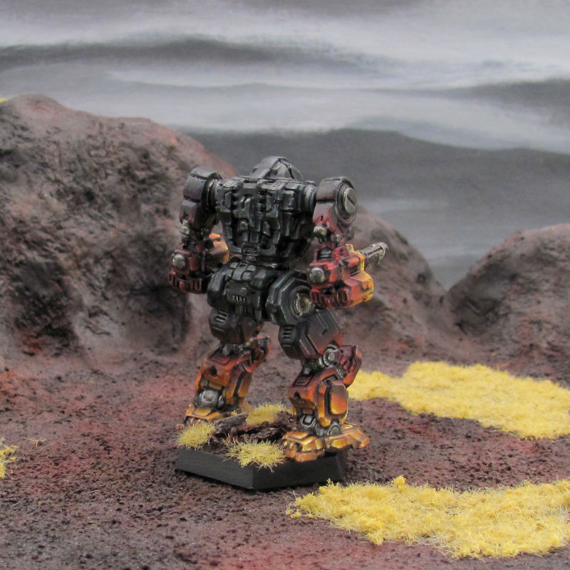 Beta Galaxy paints the body of their 'Mech black, with arms and legs transiting from dark red to bright orange or yellow.