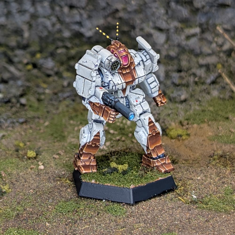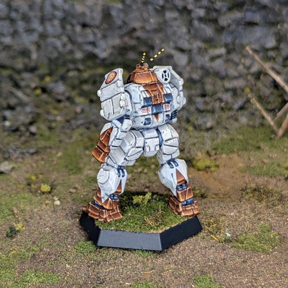Dragonlords regiments use a two-color scheme with a primary color and an accent. The accent color cover’s a ‘Mech’s entire head and comes to a downward point in the lower torso. It also appears on the legs and arms, coming to an upward point partway up each limb (or as upward-pointing triangles). The 4th uses white with copper highlights.