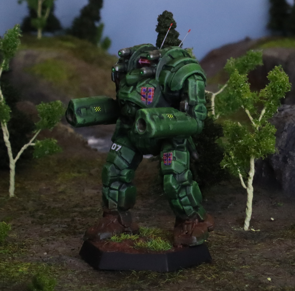 During their service to the Republic, some Highlander units painted their machines in tan, with lower arms, lower legs and sometimes the head painted in a deep forest green. Individual warriors often added narrow stripes of forest green to other areas like the upper arms or the torso of their ‘Mechs.