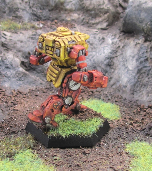 Scorpion Keshik warriors paint their equipment yellow and red, and always add gray accents. The pattern varies by the type of equipment. Yellow covers the torsos of 'Mechs and battle armor, with limbs in red. Vehicles sides are painted red, while middle sections are yellow. Aerospace units feature red in the wings and yellow in the fuselage.