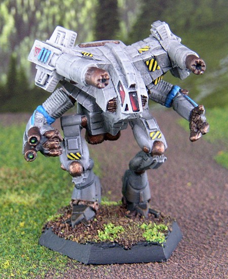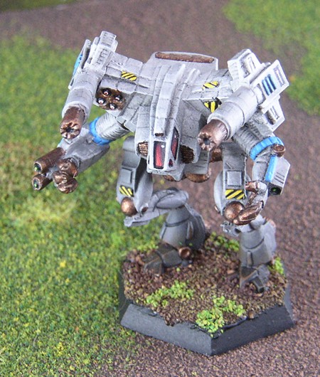 The 43rd Shadow Division paints their ‘Mechs black on lower portions (aftward for ASFs and vehicles), fading to light gray towards the top (forward for ASFs and vehicles), with blue highlights on the arms (turrets/wings).