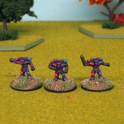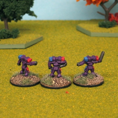 Each ‘Mech displays the Marik Militia crest – a stylized Marik Eagle on a red and blue background – on its left arm or weapons pod. The insignia of the First Marik Militia is a blue disc emblazoned with an angel who holds aloft a gleaming sword. Per FM: Free Worlds League, pages 53 and 54.