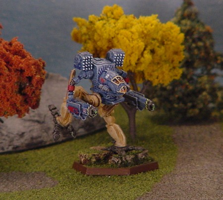 This mini was painted with Americana Salem Blue, washed with Citadel Blue Ink and highlighted with Americana Soft Blue. The lower half was painted with Americana Desert Sand, washed with Citadel Brown Ink and highlighted with Americana Fawn.