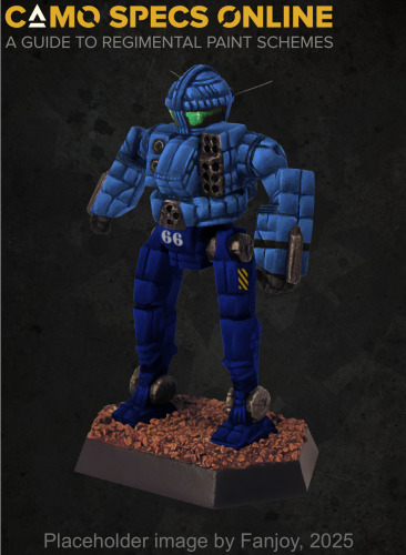 uses a blue two-tone color scheme, with navy blue coloring all 'Mechs below the waistline and sky blue for the arms, upper torso, and head. Hand actuators are uniformly painted flat black. Black striping around the right forearm of O'Gordon units also denotes the rank of the MechWarrior; no striping represents MechWarriors, one stripe indicates lance commanders, two identifies company commanders, and three signifies a battalion commander (O'Gordon`s BattleMaster, the regimental command unit, paints its entire right forearm black). The O'Gordon's insignia appears on the upper left torso and the right hip of all O'Gordon's 'Mechs. Other references: none