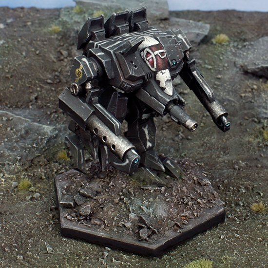 The Peacekeeper is painted in the colors of Stone’s Lament and acts as a bodyguard for Devlin Stone. The mini has been slightly modified by placing a washer and a wedge made of putty between the torso and pelvis, giving the Mech greater height and a more aggressive stance.