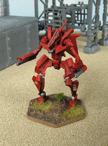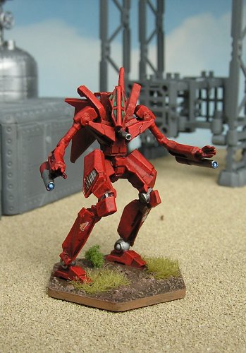 The crest of House Kurita is painted on each BattleMech’s left shoulder, with the color of the dragon changing for each regiment. The symbol of the regimental division, a blazing sword, appears on every ‘Mech’s back and on the front of the right leg.
